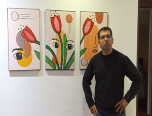 A work of contrasts, A CITY SYMBOLIC (represented by different buildings with a curved sky symbolizing its transformation and changes) which we face in our daily lives; on the right, BIOLOGY OF PARKINSON’S (represented inductively, the molecule of Dopamine, a synapse, a neuron moving through space, perhaps symbolizing neuroplasticity, in the center an INEXPRESSIVENESS (face of a human with Parkinson’s disease, with eyes of different colors showing that each person observes the condition differently, a Brain with multicolored dots representing neurological connections, highlighted with black dots (the location of the substantia nigra) and below, TULIP GARDEN, the emblematic flower of Parkinson’s, and 23th flowers representing each of the years worked as Teacher with children and young people in a school in Bogotá with successful pedagogical innovation, which the condition made me suspend.
